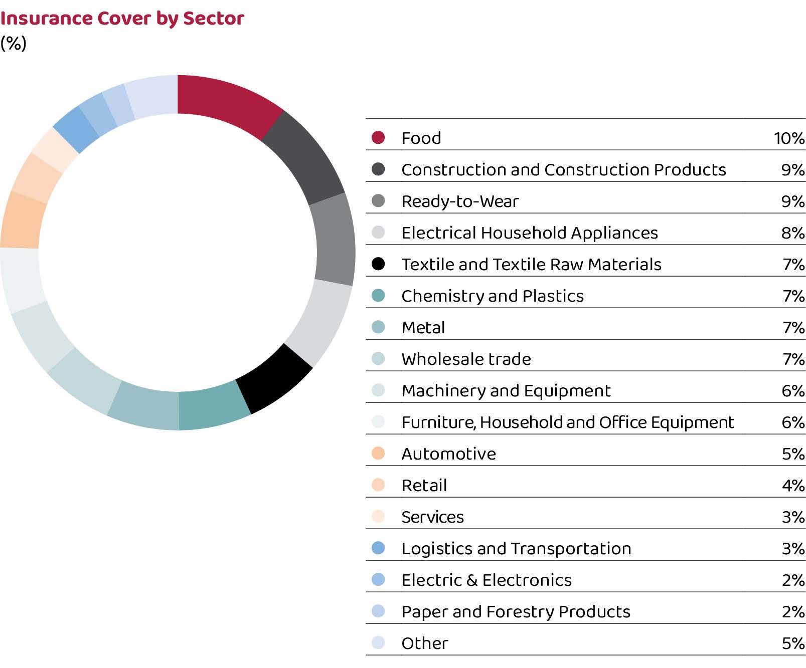 In the sectoral distribution of insured shipments, food industry took the lead with 10% share, followed by construction and construction products industry and metal, ready-to-wear and garment industry with 9% share each.