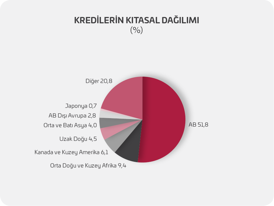 Bankamızdan kredi kullanan ihracatçı firmaların, ihracat gerçekleştirmeyi taahhüt ettikleri ülkelerin dağılımında %52’lik oran ile AB ülkeleri ilk sırada yer almaktadır.
