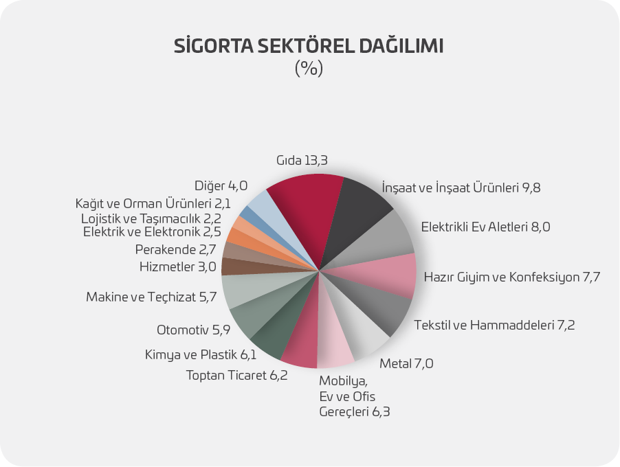 Sigortalanan sevkiyatın sektörel dağılımında, %13’lük pay ile gıda sektörü birinci sırada yer almakta iken ikinciliği %10’luk pay ile inşaat ve inşaat ürünleri, %8’lik kısmı elektrikli ev aletleri ve hazır giyim ve konfeksiyon paylaşmaktadır.