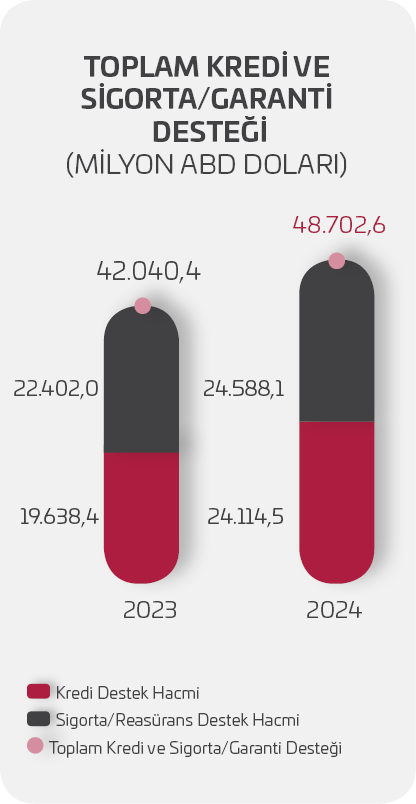 2024 yılında Kısa Vadeli İhracat Kredi Sigortası, Kısa Vadeli Yurt İçi Kredi Sigortası ve Spesifik İhracat Kredi Sigortası kapsamında toplam 24,6 milyar ABD doları tutarında sevkiyat sigortalanmıştır.
