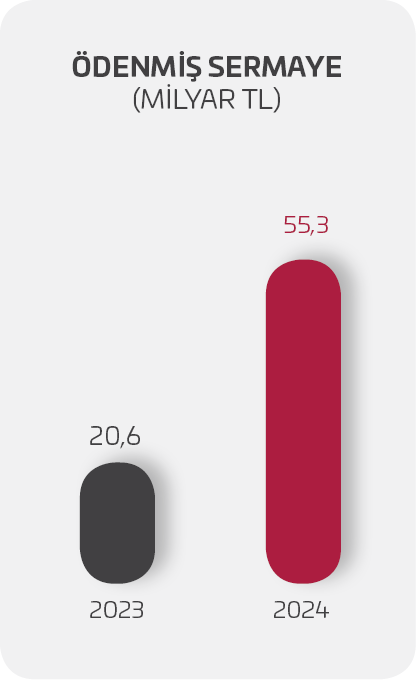 Ayrıca; Ekim 2024’te yapılan esas sözleşme değişikliği ile de 19,6 milyar TL olağanüstü yedek akçelerden aktarılarak Banka ödenmiş sermayesi 55,3 milyar TL’ye yükseltilmiştir. Sermaye artırım işlemleri tamamlanmış ve böylelikle Bankamızın güçlü sermaye yapısı korunmaya devam edilmiştir.