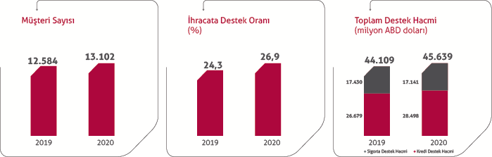 Kısa Vadeli İhracat Kredi Sigortası, Kısa Vadeli Yurt İçi Kredi Sigortası ve Orta-Uzun Vadeli İhracat Kredi Sigortası kapsamında 2020 yılında toplam 17,1 milyar ABD dolarlık sevkiyat sigortalanmıştır.