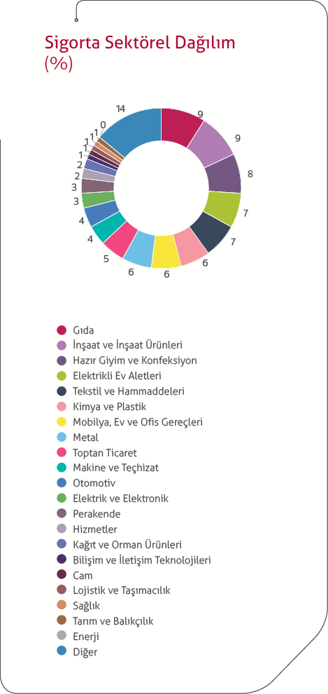 Sigortalanan sevkiyatın sektörel dağılımında, %9’luk pay ile inşaat ve inşaat ürünleri sektörü ile gıda sektörü ilk sırayı paylaşmakta, %8’lik pay ile hazır giyim ve konfeksiyon ikinci sırada, % 7’lik pay ile elektrikli ev aletleri sektörü üçüncü sırada yer almaktadır.