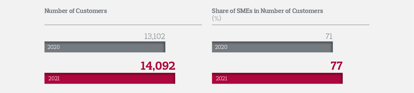 As a result of additional funds provided to the SMEs, prioritization of their credit requests, and term extension support offered, TL 14.2 billion in local currency and USD 2 billion in foreign currency were allocated in the form of credit support, and total SME credits amounted to USD 3.6 billion. Accordingly, 16% of the Bank’s credit support were allocated to SMEs