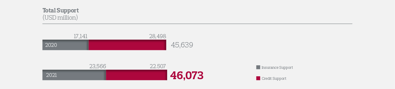 During 2021, shipments with a total worth of USD 23.5 billion were insured under Short-Term Export Credit Insurance, Short-Term Domestic Credit Insurance and Medium-Long Term Export Credit Insurance, and reinsurance support was provided for Turkish goods and services worth USD 60 million.