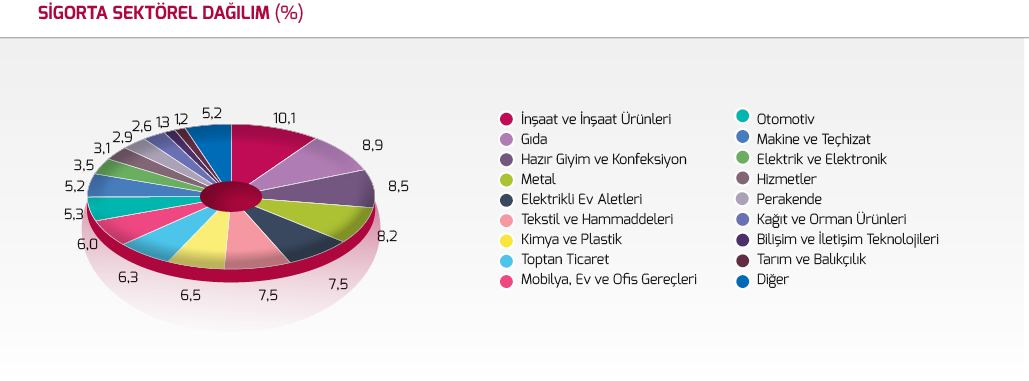 Sigortalanan sevkiyatın sektörel dağılımında, %10’luk pay ile inşaat ve inşaat ürünleri sektörü birinci sırada yer almakta iken ikinciliği %9’luk payları ile gıda sektörü ile, hazır giyim ve konfeksiyon sektörü paylaşmaktadır.