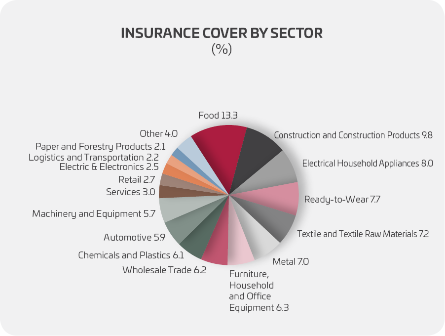 In the sectoral distribution of insured shipments, food industry took the lead with 13% share, followed by construction and construction products industry with 10% share, and electrical household appliances and ready-to-wear and garment industry with 8% share each.