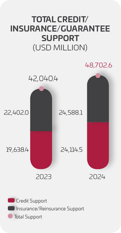 During 2024, shipments with a total worth of USD 24.6 billion were insured under Short-Term Export Credit Insurance, Short-Term Domestic Credit Insurance and Medium-Long Term Export Credit Insurance.