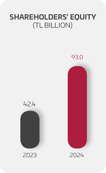 Shareholders’ equity increased to TL 93.0 billion, corresponding to a rise by 119.2%.