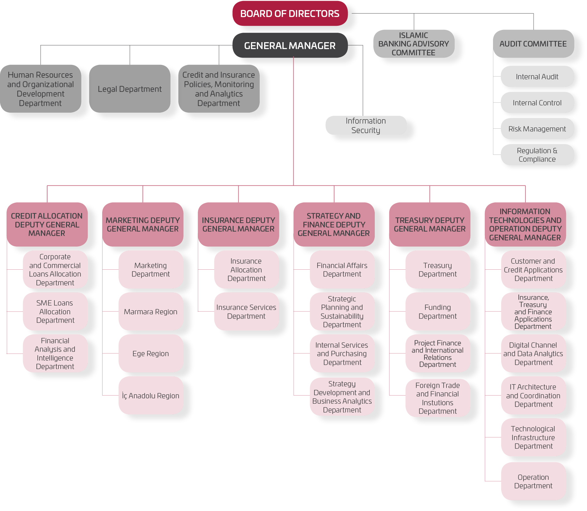 - Organizational changes and new additions were made to our Information Technologies and Operation job family for increasing the efficiency of our Bank’s Information Technologies and Operation Units, clarifying the functional segregations in line with the needs of our Bank’s internal stakeholders, vesting their internal management in a more effective structure and transforming them into a structure that will better adopt to the developments and novelties in the banking industry. Accordingly, Customer and Credit Applications Directorate; Insurance, Treasury and Finance Applications Directorate, Digital Channel and Data Analytics Directorate, and IT Architecture and Coordination Directorate were set up, which also incorporate the tasks and affairs handled by the previous structure. Sections were established under these departments to accommodate changes and novelties stemming from the functional segregations and requirements mentioned above.