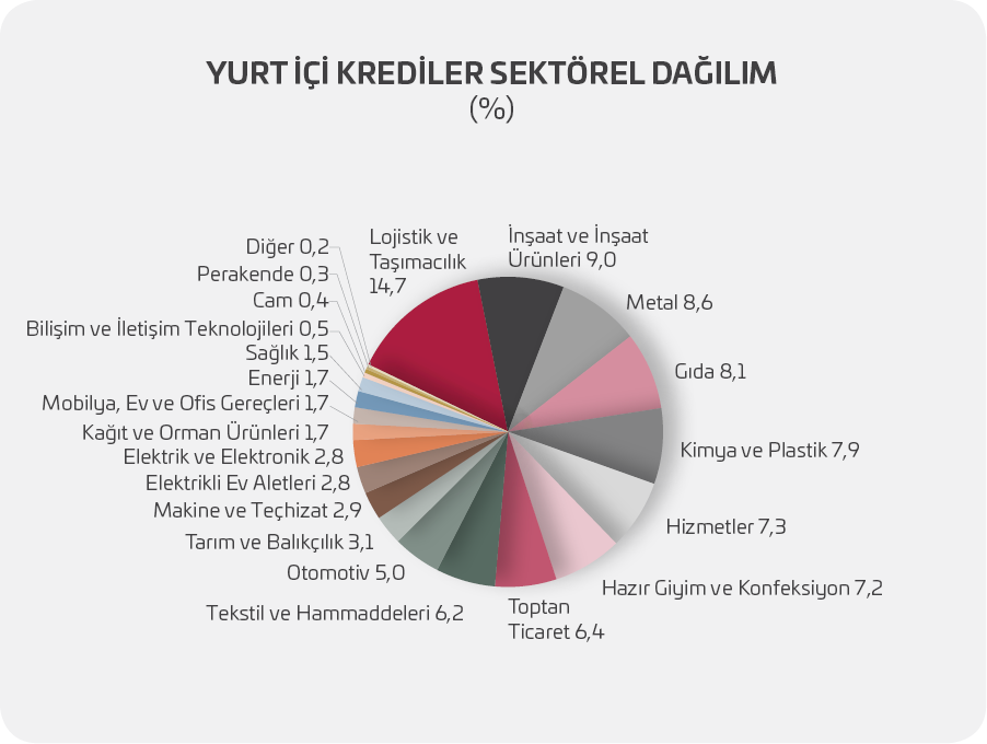 Kredilerin sektörel dağılımında ise %15 pay ile lojistik ve taşımacılık sektörü başta gelmektedir.