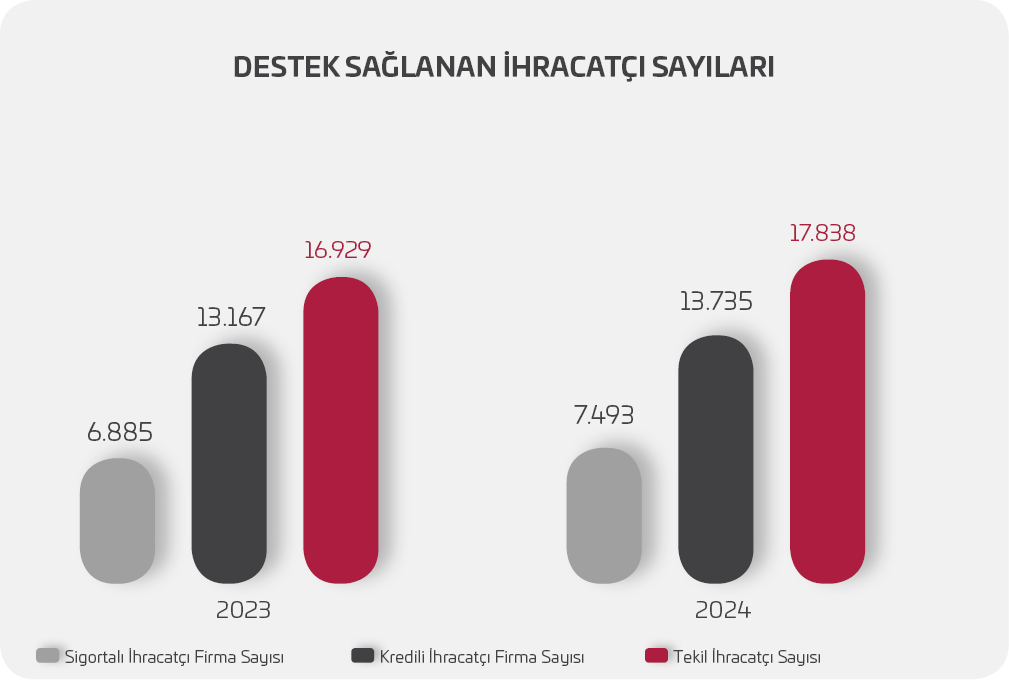 2024 yılında Türkiye ihracatı içerisinde ağırlıklı paya sahip 13.735 firma Türk Eximbank kredi programlarından yararlanmıştır.